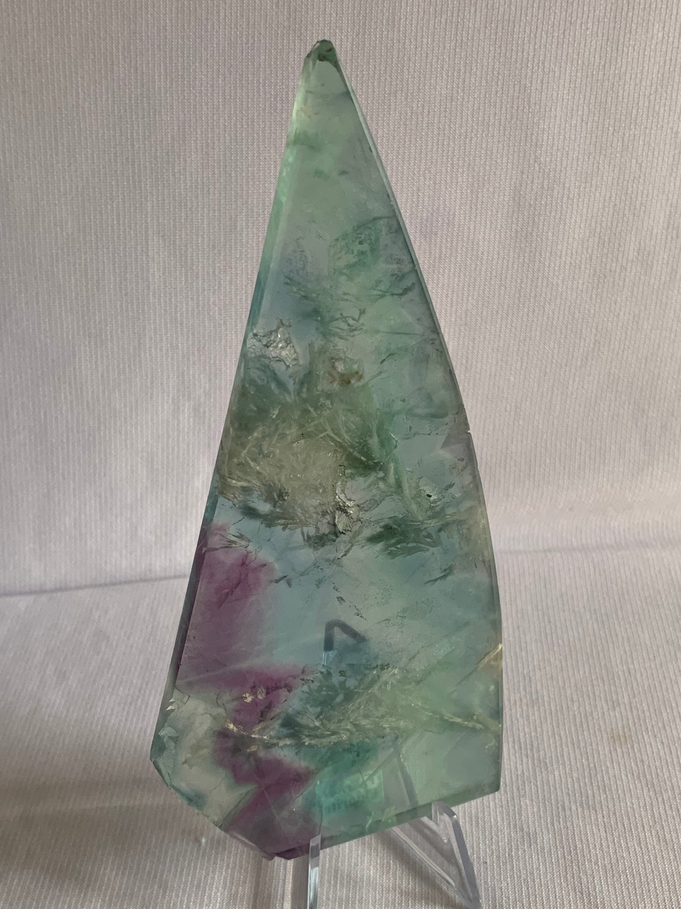 This striking Feather Fluorite Slab is a polished freeform display piece showcasing fluorite’s beautiful translucent greens and subtle purples, highlighted by dramatic natural feather-like inclusions that look like frozen plumes or mineral landscapes within the stone.