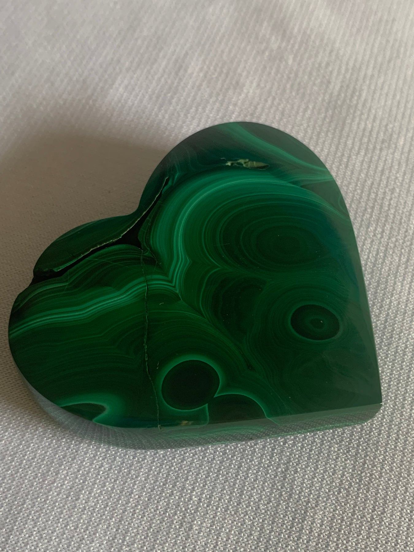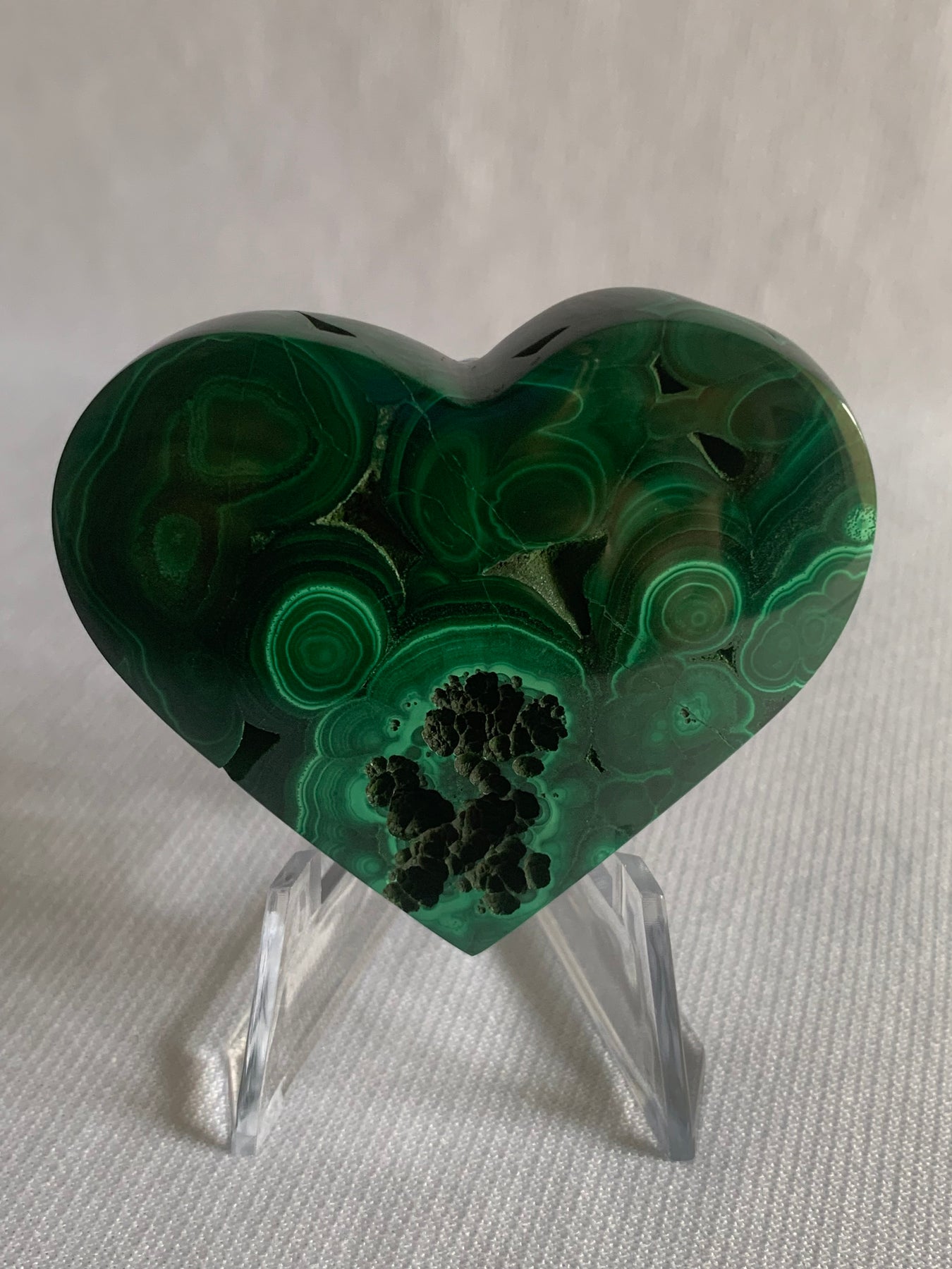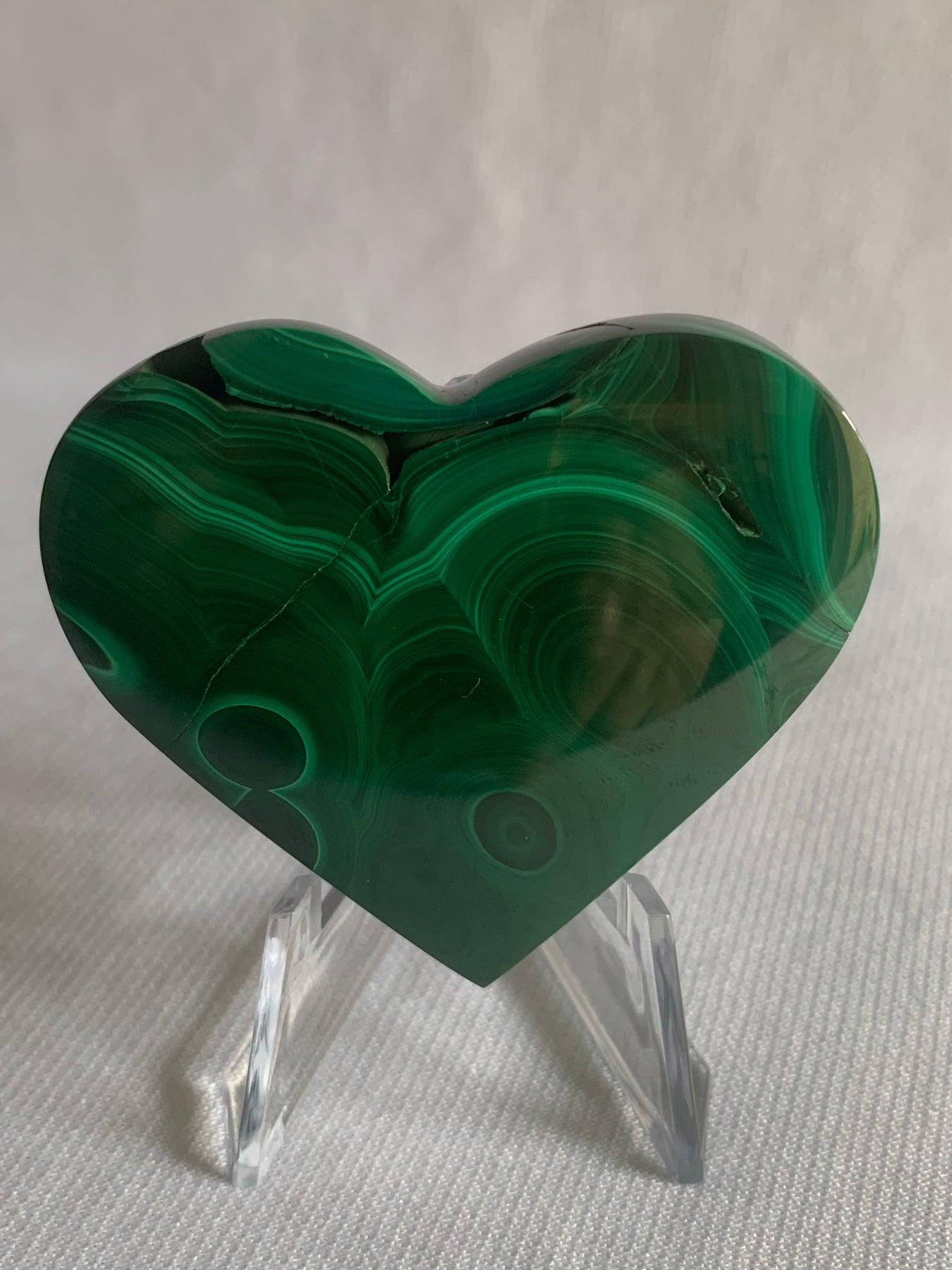 This polished Malachite heart is a powerful symbol of love, transformation, and protection. Rich emerald and forest-green banding flows across the surface in natural concentric patterns unique to malachite, creating a piece that feels both grounding and deeply heart-centered.