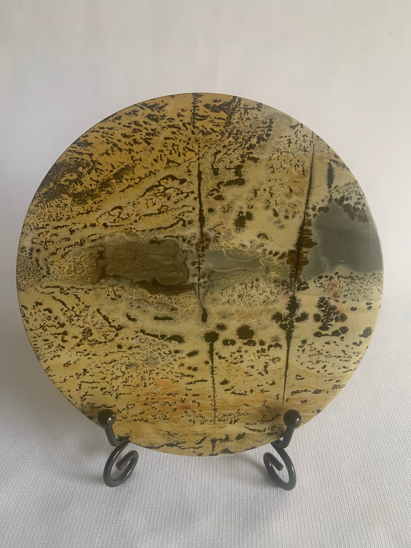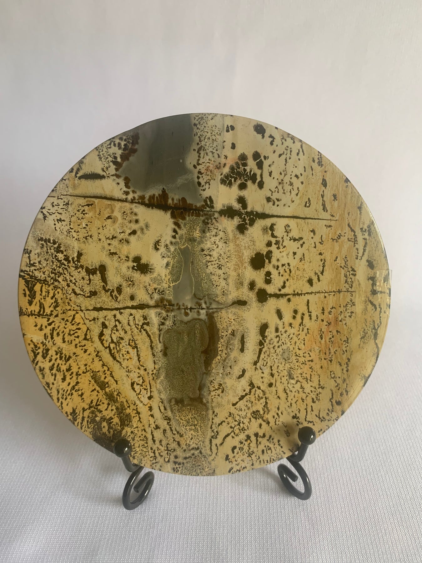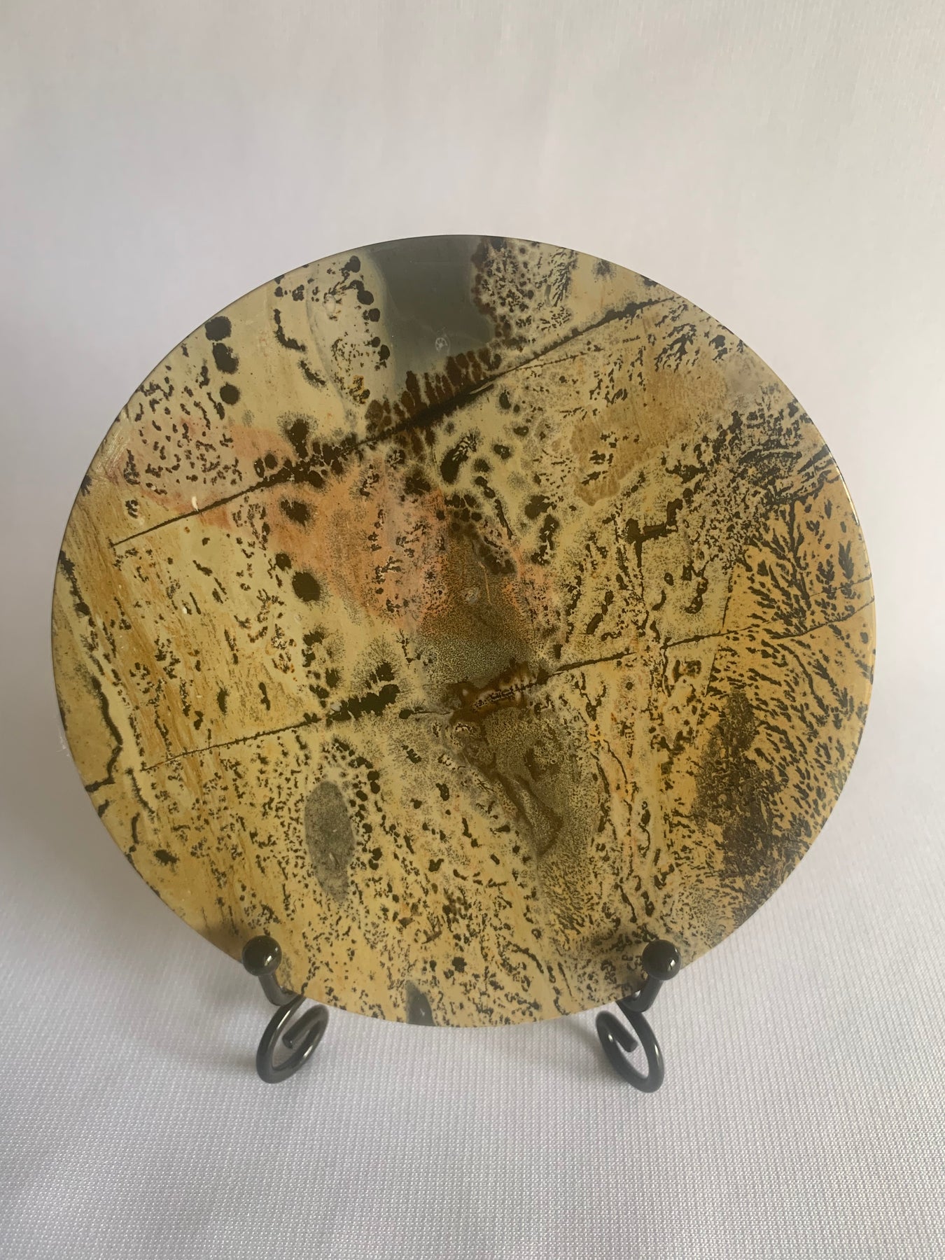 • Bring the grounding calm of the Earth into your sacred space — a reminder, in the soft golds of autumn, to stay rooted while embracing change.  This Disc measures 4  7/8 " in diameter and comes with stand