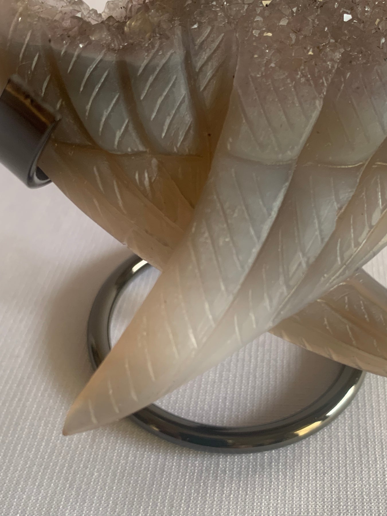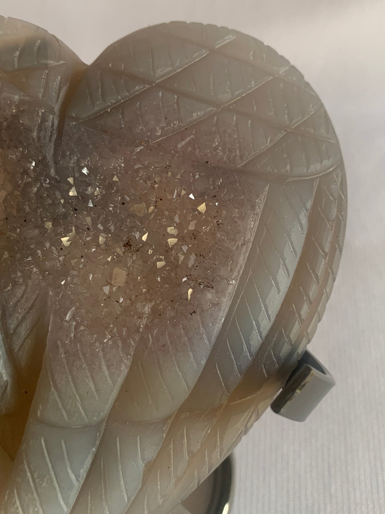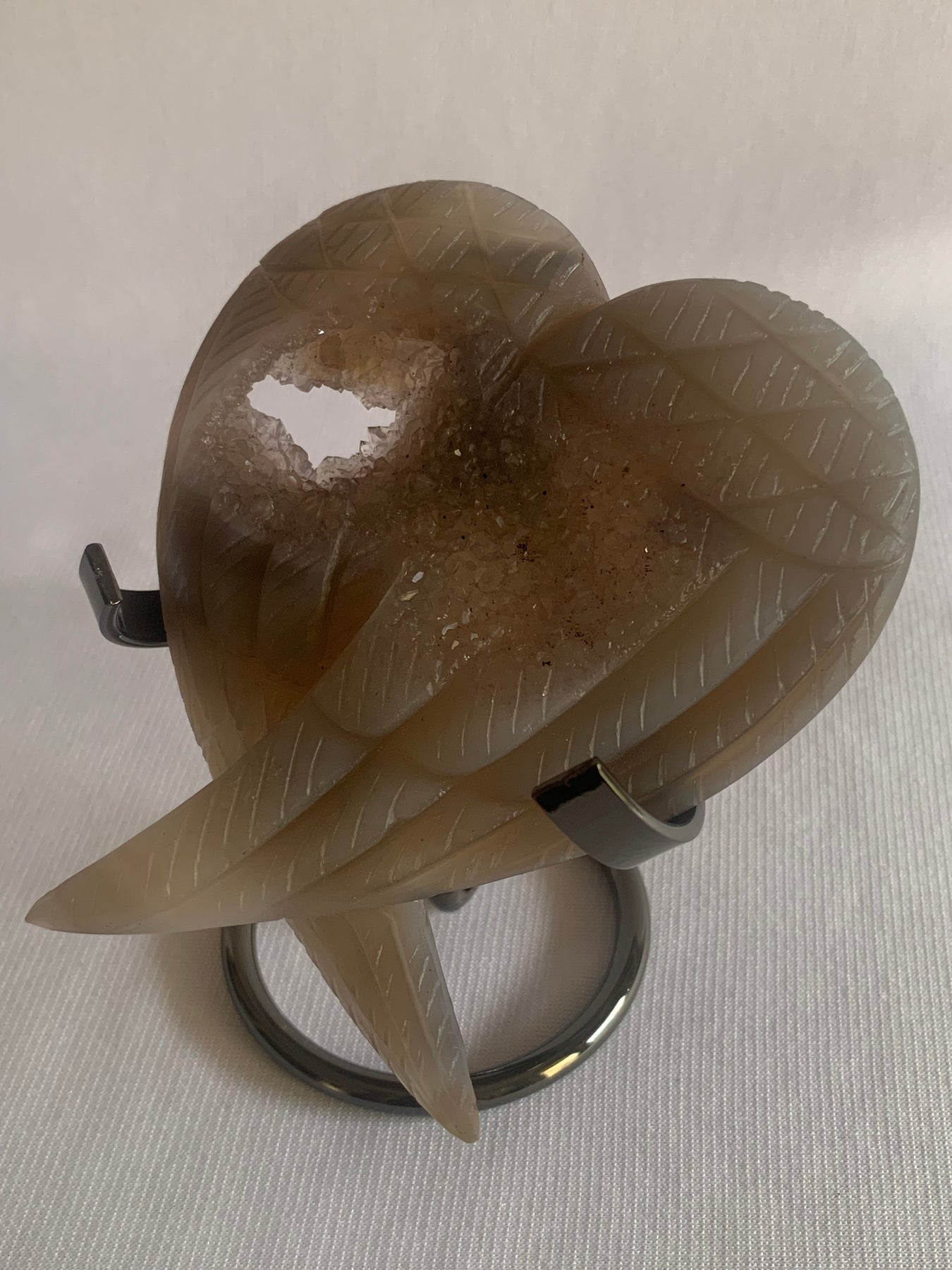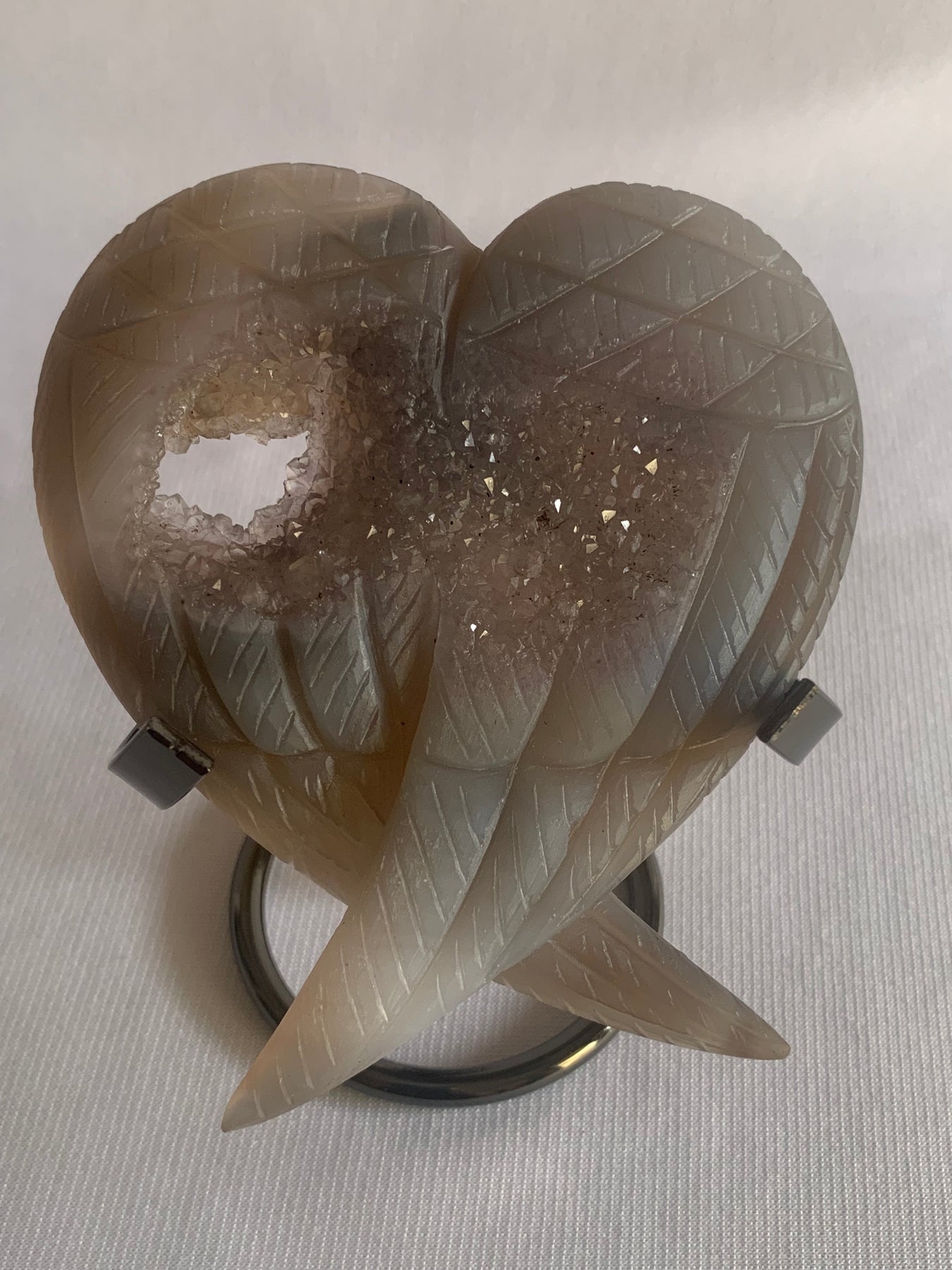 This stunning hand-carved piece features a pair of angel wings gently crossed in the shape of a heart, highlighted by a natural druzy opening that sparkles with tiny crystal points. Druzy Agate is known for its calming, stabilizing energy — a stone of inner peace, emotional healing, and spiritual protection.