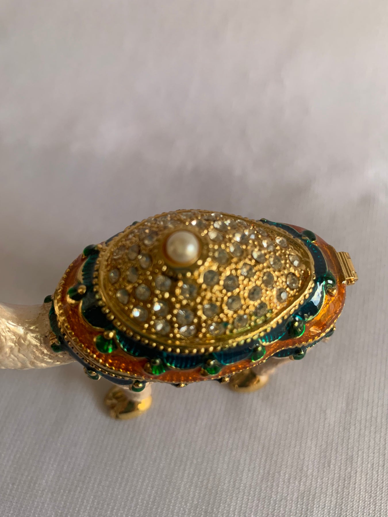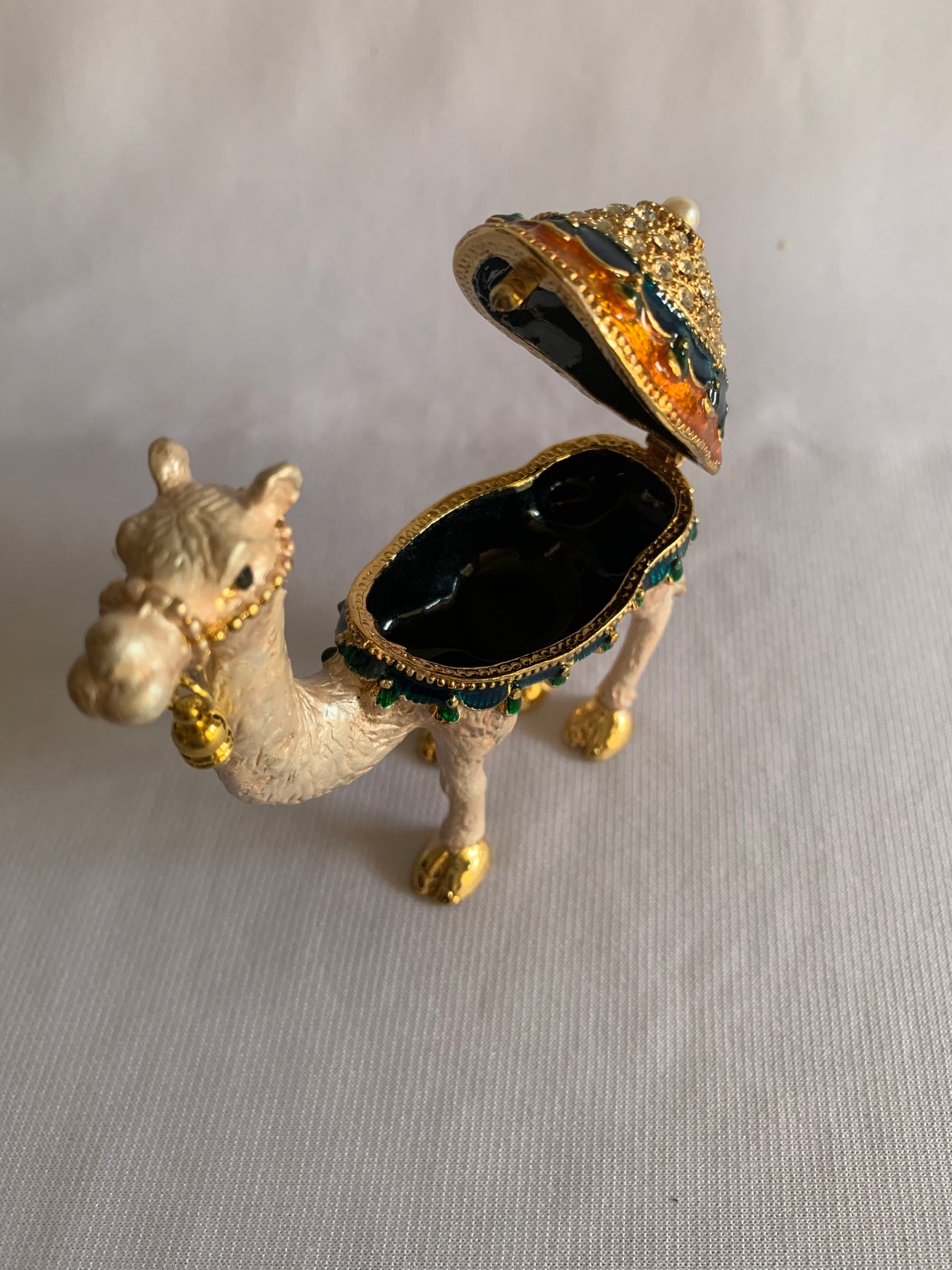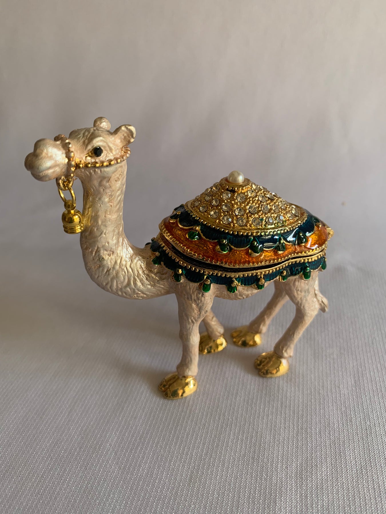 This exquisitely detailed camel is adorned like a royal traveler — with golden hooves, jeweled saddle, and a tiny bell at its neck. The saddle gently lifts to reveal a hidden compartment, perfect for storing a tiny crystal, prayer, ring, coin, or intention.